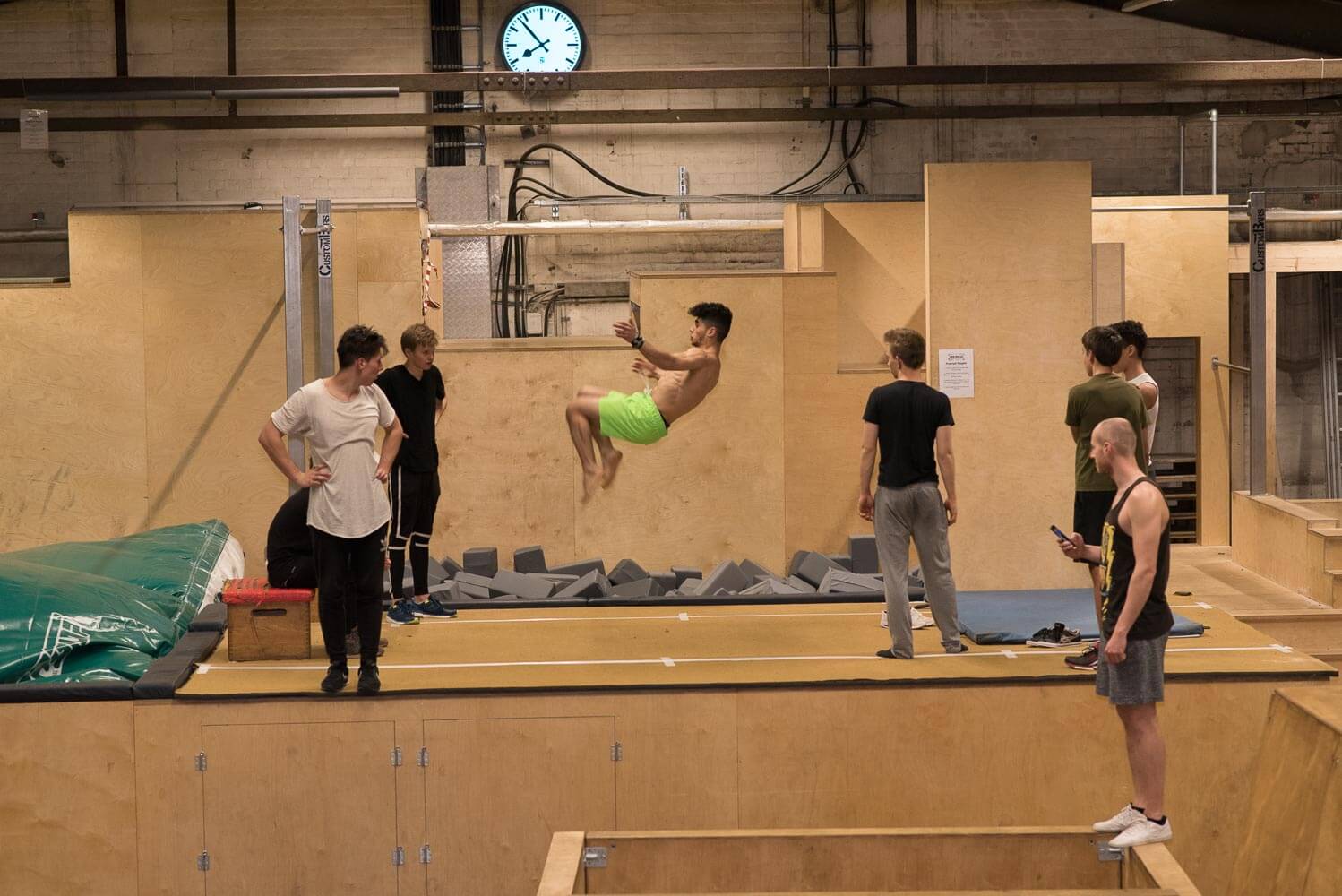 In einem neuen Projekt bauen die Teilnehmer aus Restmüll Parkour-Hindernisse – dieser nachhaltige Ansatz soll die Identifikation mit der Halle fördern. Neben vielen ehrenamtlichen Helfern arbeiten hier heute auch angestellte Trainer, insgesamt kümmern sich 42 Mitarbeiter darum, dass auf den 800 Quadratmetern sichere Rahmenbedingungen für alle geschaffen werden und geben Tipps. „Der Sport ist längst nicht so verletzungsintensiv wie viele denken. Ganz im Gegenteil“, betont Sebastian, „du lernst vorher, richtig zu fallen, das Risiko einschätzen und mit der Angst umzugehen. Das schützt.“