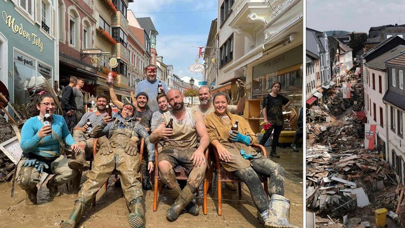Das Wasser stand noch drei Tage in Ahrweiler. Wer konnte, begann umgehend mit den Aufräumarbeiten. Alle versuchten so schnell wie möglich den Schlamm aus den Häusern zu bekommen. Der braune Brei stinkt fürchterlich und brennt auf der Haut, wie Nicki berichtet. Mit dem Ausräumen durchtränkter Möbel und verschlammtem Mix an Unrat türmten sich Müllberge Meter hoch in den Straßen und wurden zunehmend zu einem ernsthaften Problem: Seuchengefahr! Kein Strom, kein Gas, kaum sauberes Wasser und kein funktionierendes Telefonnetz. Der Ausnahmezustand im Ahrtal ist auch von außen deutlich spürbar.
