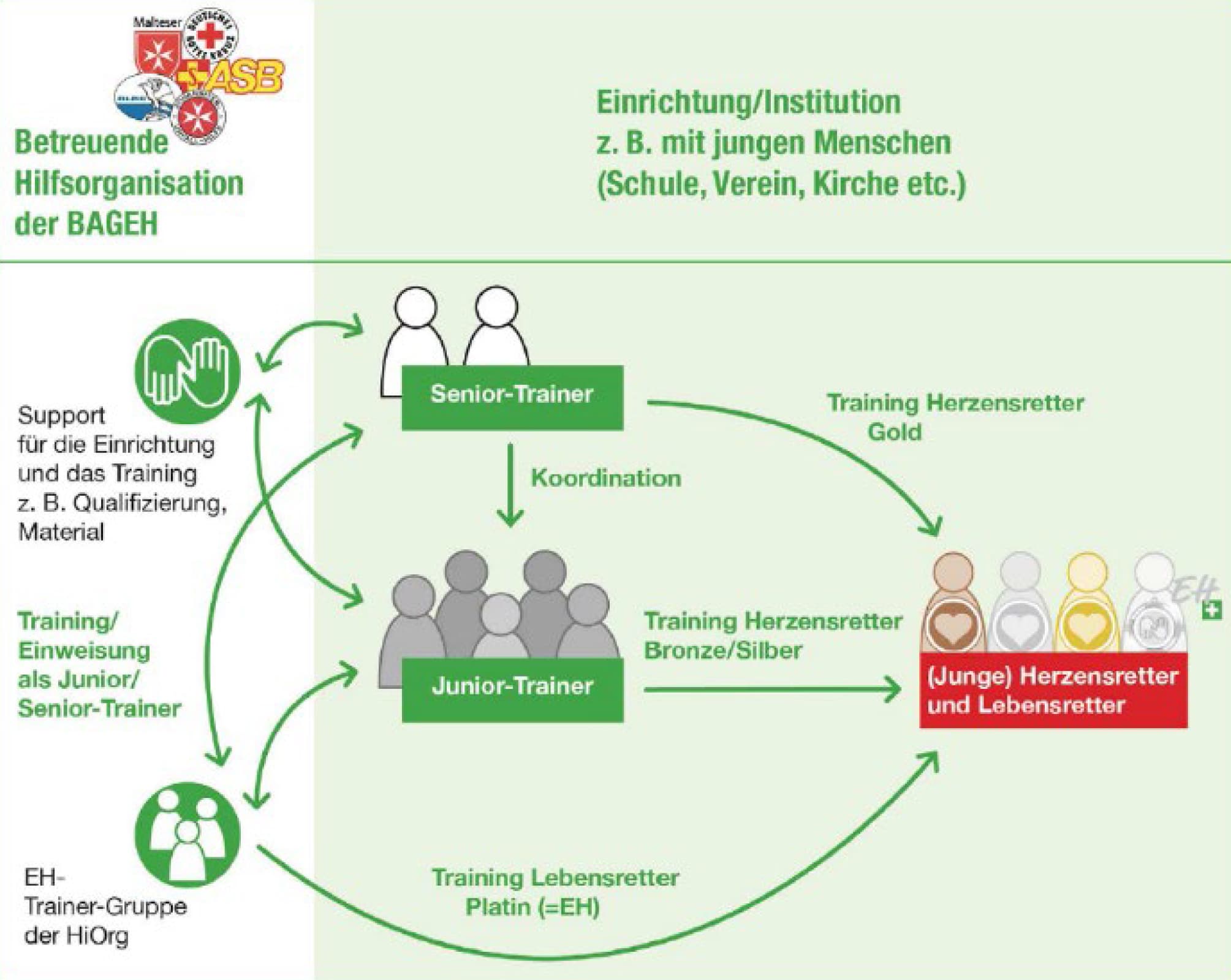 Die Qualifizierung und Betreuung der der Junior-Trainer erfolgt durch die Betreuenden Hilfsorganisationen.Neben der eigenverantwortlichen Durchführung der Trainings für Herzensretter Bronze und Silber erhalten die Junior-Trainer ebenfalls die Möglichkeit zur Assistenz im Rahmen der weiteren Kursangebote der Betreuenden Hilfsorganisationen.