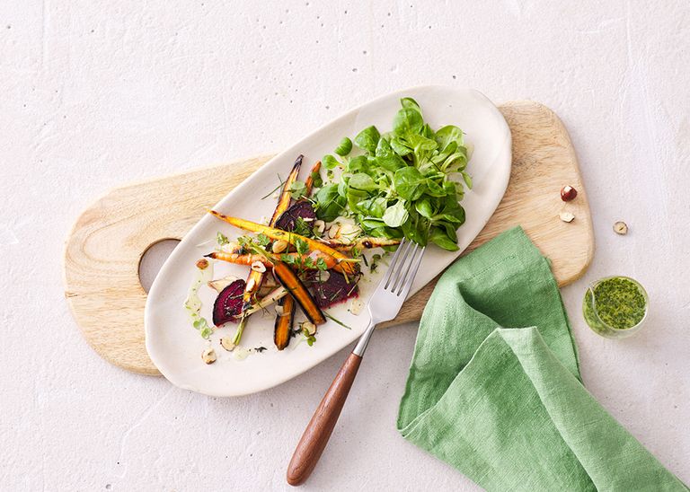 Gebackene Wurzeln und Rüben mit Haselnuss, Feldsalat und Holunder-Vinaigrette