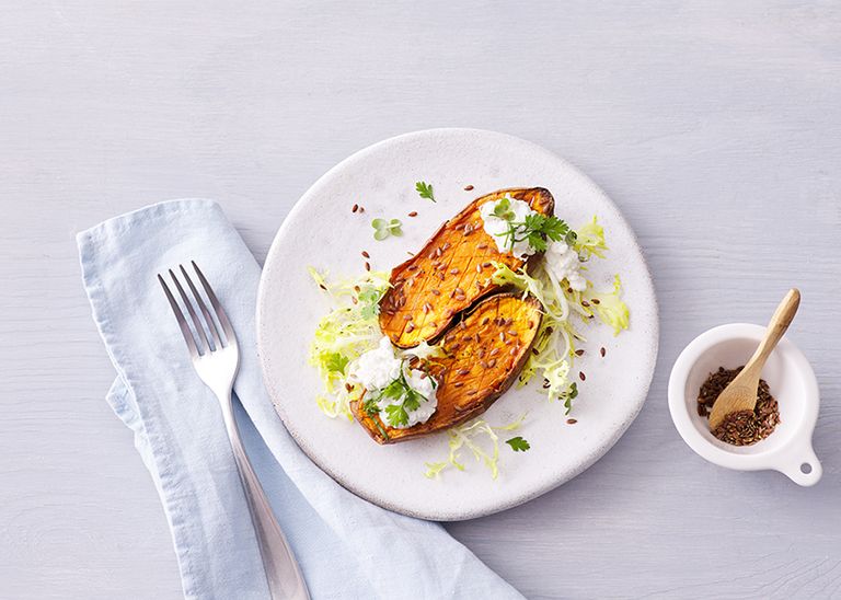 Gegrillte Süßkartoffel mit Friséesalat in Schnittlauch-Dressing, Leinsaat und Hüttenkäse