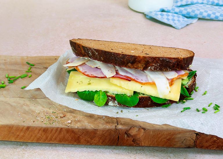 Landbrot mit Alpenkräuterbutter, Bergkäse, Krustenbraten-Schinken, gepickeltem Sellerie und Feldsalat