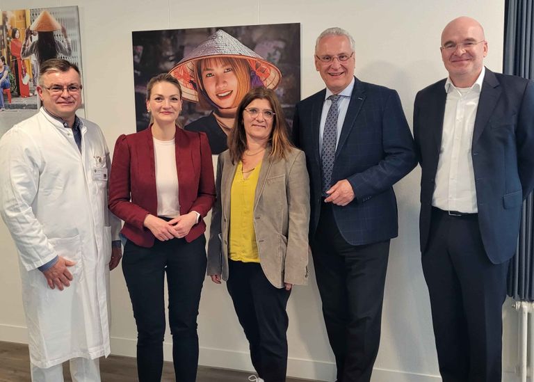 Die Bayerische Staatsministerin für Gesundheit, Pflege und Prävention, Judith Gerlach, tauscht sich mit Verantwortlichen des Malteser Waldkrankenhauses St. Marien in Erlangen aus.