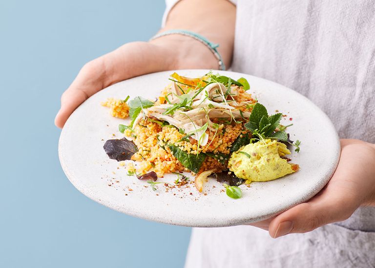 Couscous-Spinat-Salat mit gezupftem Huhn und Dattel-Frischkäsedip