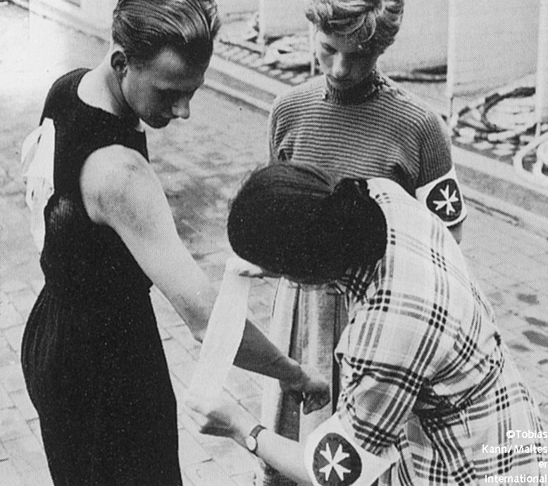 Zum ersten Sanitätseinsatz des 1953 gegründeten Hilfsdienstes kam es dann beim Sportfest der „Deutschen Jugendkraft“ (DJK) im September 1954 in Münster, bei dem eine Armbinde mit Malteserkreuz die noch nicht vorhandene Einsatzmontur ersetzen musste.