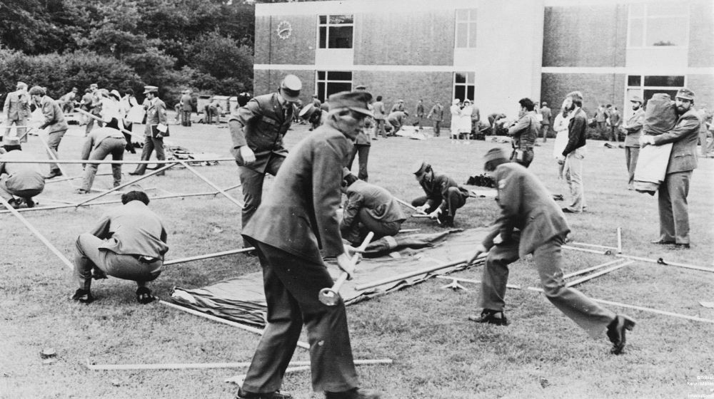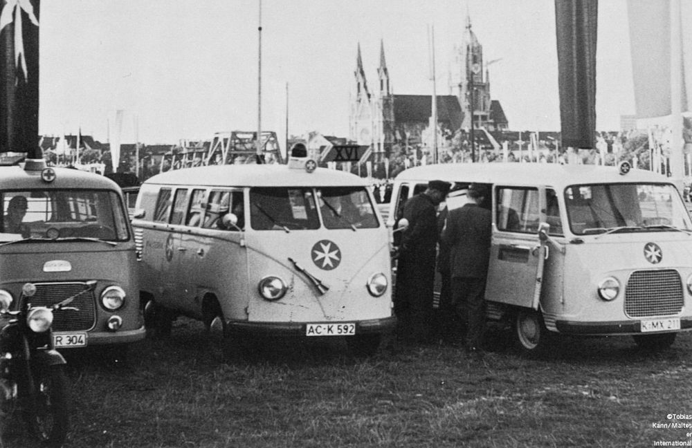 München 1960: Einsatzkräfte der Malteser ziehen beim Eucharistischen Weltkongress als quasimilitärische „Sanitätsstreife“ abends durch die Stadt, um ihre feiernden Kollegen aus den Bierkellern zu holen. 1959: In vielen Tankstellen im Bundesgebiet werden Unfallhilfsstellen eingerichtet, in denen je eine Sanitätstasche, eine Sanitätskiste K 50 und eine Krankentrage deponiert werden. Der Malteser Sanitätsdienst, dessen erster Einsatz bereits 1954 stattfand, hatte sich in Windeseile etabliert.
