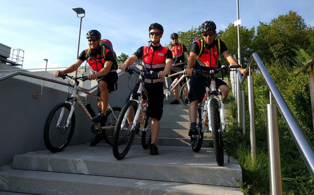 Und die sanitätsdienstliche Fortbewegung findet auch schon mal auf dem Fahrrad, dem Segway, dem Offroader oder dem Pferderücken statt.