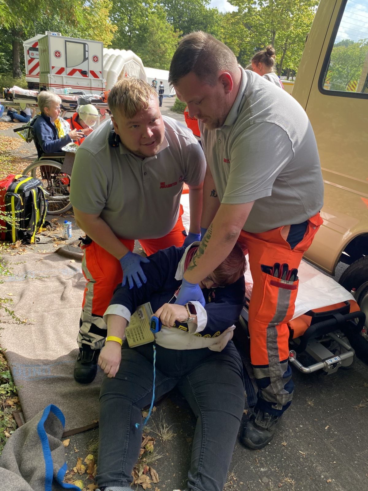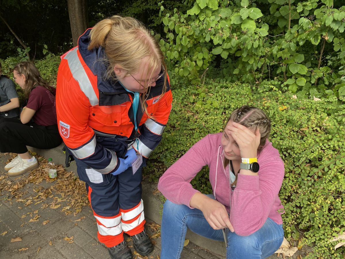 In nicht allzu weiter Entfernung zu den beiden sind auch ihre Kolleginnen und Kollegen im Zuge der Betreuung zahlreicher „“Festivalbesucher“, die unter Schock stehen und zum großen Teil Ansprache benötigen, im Einsatz. Während die einen Helferinnen Wasser an die Masse verteilen und beruhigend auf verzweifelte Jugendliche einwirken oder gegebenenfalls sogar PSNV ( Psychosoziale Notfallversorgung) hinzuziehen, registrieren andere Kollegen schon einmal all jene, die sich in einer Schlange am Malteser Fahrzeug aufgestellt haben. Auch hier wirkt alles tatsächlich wie reales Geschehen.