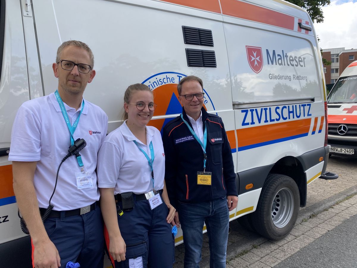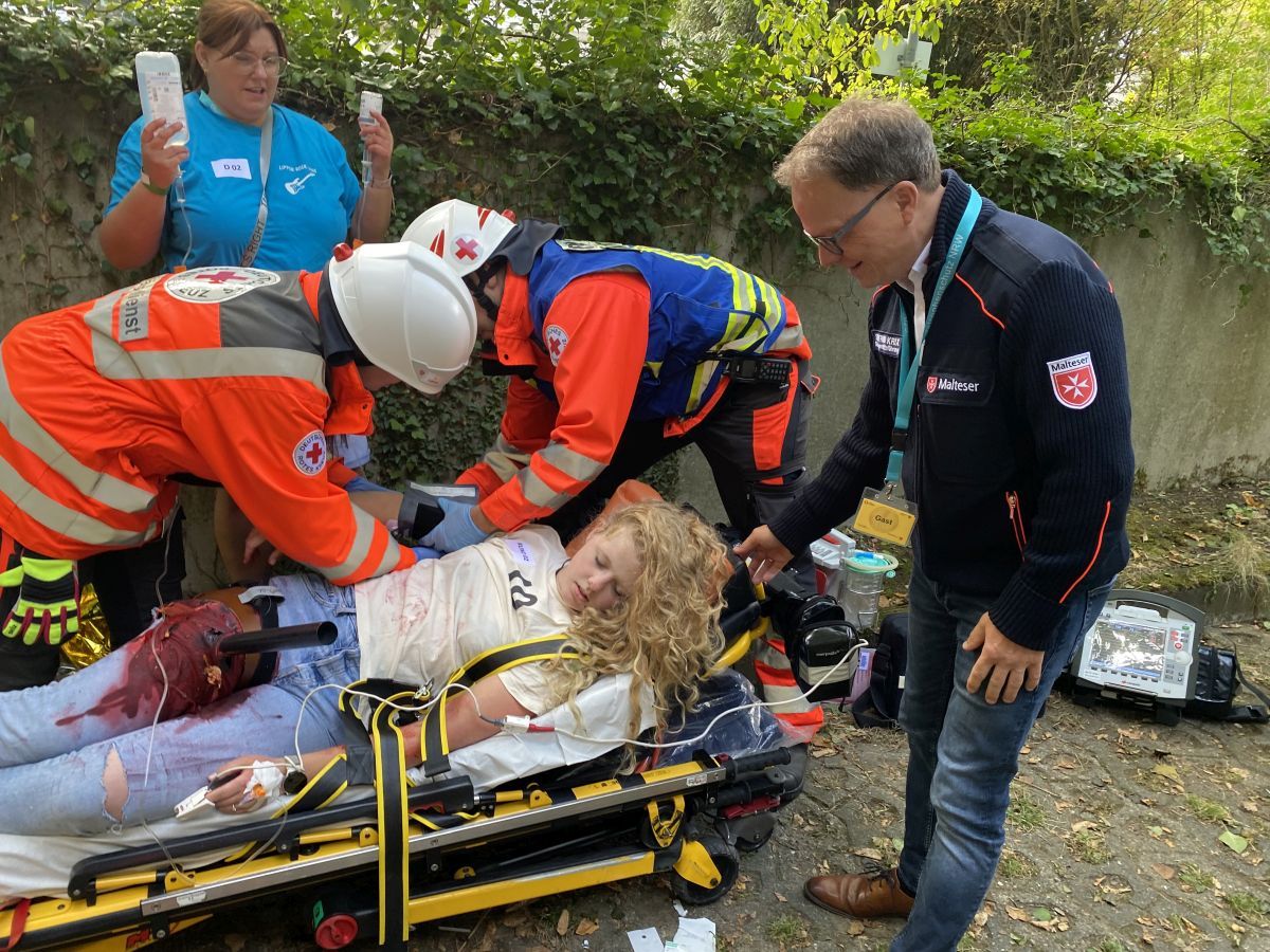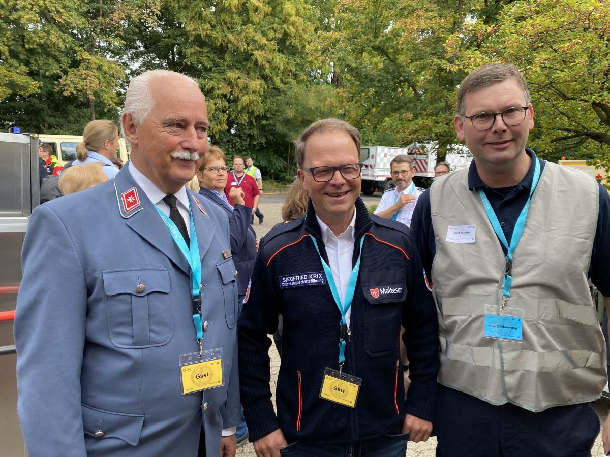Auf die Frage, wie wichtig es für die Malteser ist, an einer solchen bislang einzigartigen Übung zu partizipieren, sagt Diözesangeschäftsführer Siegfried Krix: „Übungen sind einfach extrem wichtig. Wir müssen Erkenntnisse daraus gewinnen, wie die einzelnen Einheiten zusammenspielen, wo wir vielleicht Schwachstellen haben, womöglich nachbessern müssen und was wir daraus lernen können. Heute geht es nicht darum, dass alles bereits 100-prozentig funktioniert. Wenn das so ist, dann freuen wir uns natürlich, aber es geht ja darum, aus dieser Übung zu lernen und eventuell nachzubessern, denn der beste Plan vom grünen Tisch nützt nichts, wenn man nicht immer wieder übt und in der Praxis erprobt.“