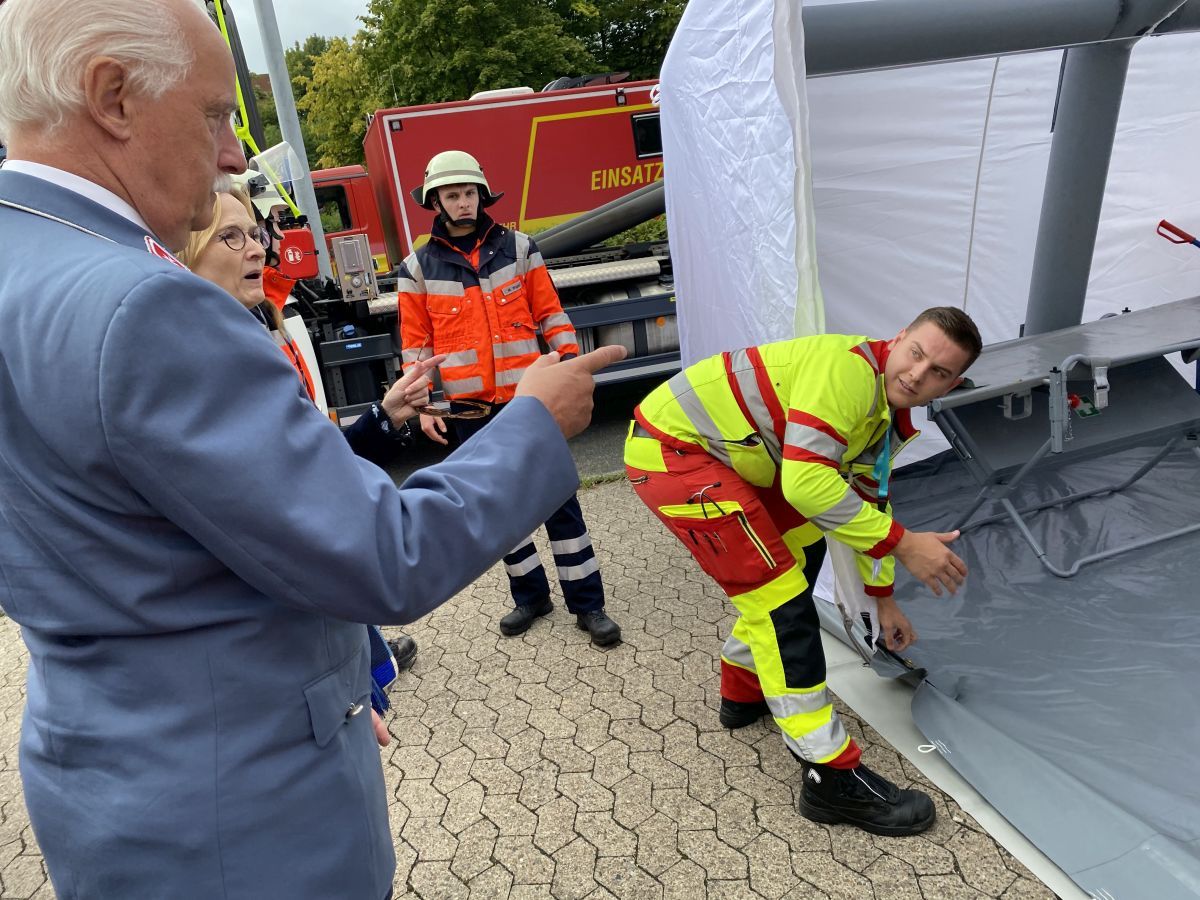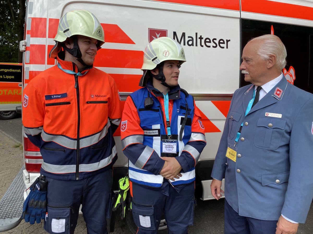 Nur wenige Meter weiter trifft der Herzog dann erstmals auf an der Übung beteiligte Malteser. Im Rahmen des Sonderbedarfs Rettungsdienst waren die Kollegen aus dem Kreis Lippe alarmiert worden. Im Austausch mit dem NRW- Landesbeauftragten schildern Tim Stiller und Bennett Weber aus Lage sodann ihre Freude drüber, Teil dieses ganz besonderen Trainings sein zu können und erklären dem Herzog ihre Aufgaben am heutigen Tag.