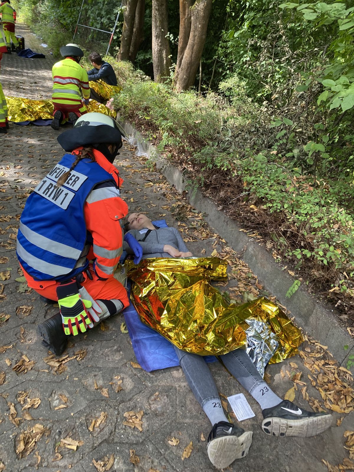 Detmold. Das Szenario gestaltet sich düster: Die Landschaft gleicht einem Katastrophengebiet mit umherliegenden Trümmerteilen und unzähligen verletzten Menschen, die teilweise hockend, regungslos oder zusammengekrümmt am Boden liegend darauf warten, schnell medizinische Hilfe zu erhalten. Blutverschmierte Körper, sogar Tote, säumen den Wegesrand oder liegen im unwegsamen Gelände. Das Geraschel goldfarbener Rettungsdecken mutet allenthalben beinahe surreal an.