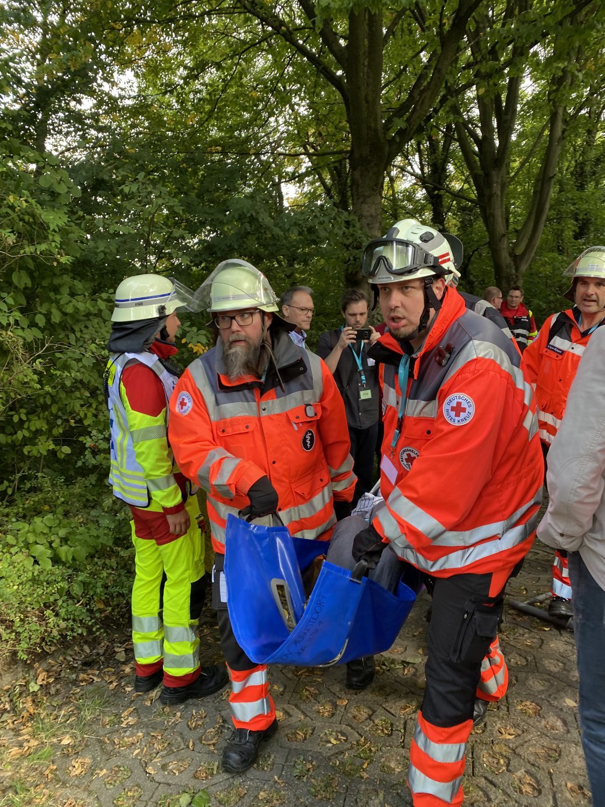 „Wir rechnen eigentlich damit, dass wir gleich einen leichter verletzten Patienten transportieren müssen.“ So seien Patienten in die Kategorien rot, gelb und grün eingeteilt. Rot stehe dabei für die Schwerverletzten, das übernähmen die Rettungswagen. „Da wir einen KTW haben, werden wir eher grün-verletzte Patienten haben“, ergänzt sie. Das könne ein Armbruch sein oder ein umgeknickter Fuß. „Also eher ganz leichte Dinge, die wir einfach nur ins Krankenhaus bringen. Aber auch Leute, die unter Angst und Panikattacken leiden.“ Rudolph Herzog von Croÿ spricht die Tatsache an, dass erstmals auch ein Krankenhaus in eine derartige Übung involviert ist. Dies bewerten Chiara und ihr Kollege als ausgesprochen wichtig.