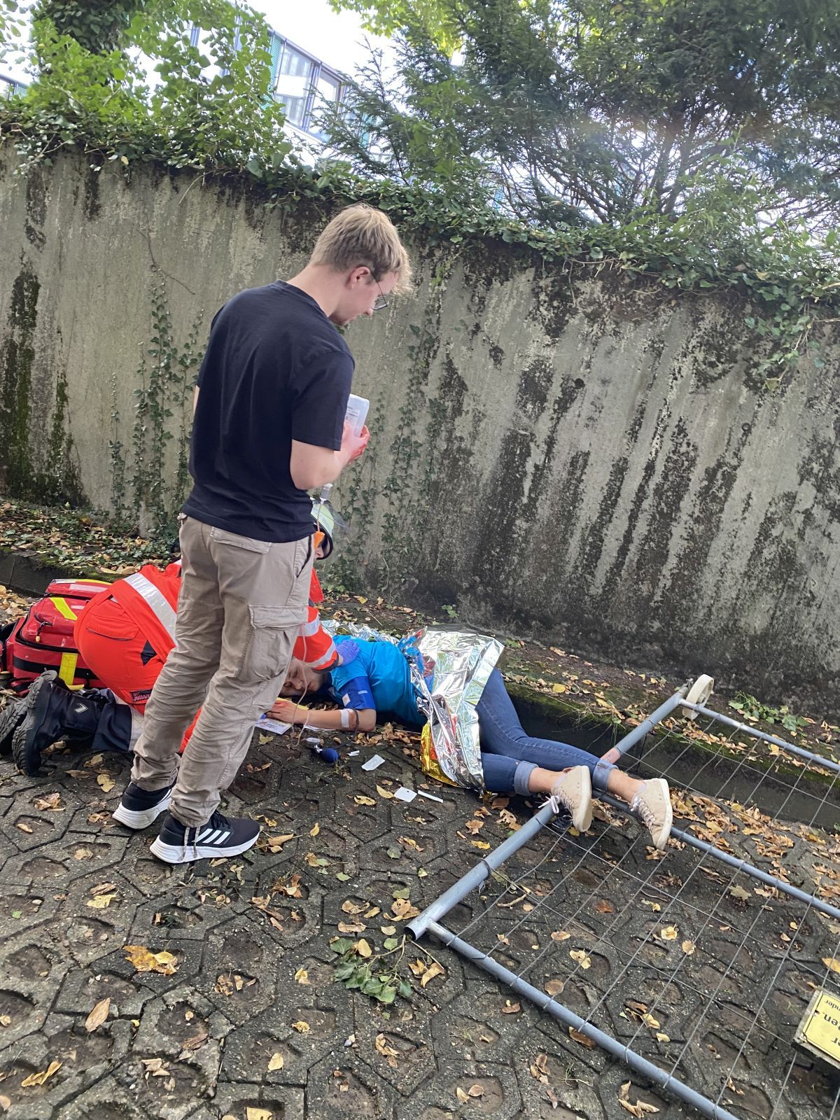 Zunächst geht es in einen gepflasterten Weg unterhalb des Kreistagsgebäudes. Sascha Medina führt Besuchergruppe 1 an und erläutert, wie der Rundgang geplant ist. Hier befinden sich gerade unzählige Komparsen, die so glaubwürdig Verletzte geben, dass man sich unweigerlich wie in einem echten Katastrophenszenario wähnt. Immer wieder wird hier vor Schmerzen geschrien, laut gestöhnt oder verzweifelt gejammert. Die professionell anmutenden Verletzungen verbreiten trotz der Kenntnis des Umstands, dass sie alle nur geschminkt sind, eine gewisse Anspannung unter den Gästen, denn alles wirkt einfach unfassbar real. Und genauso soll es sein.