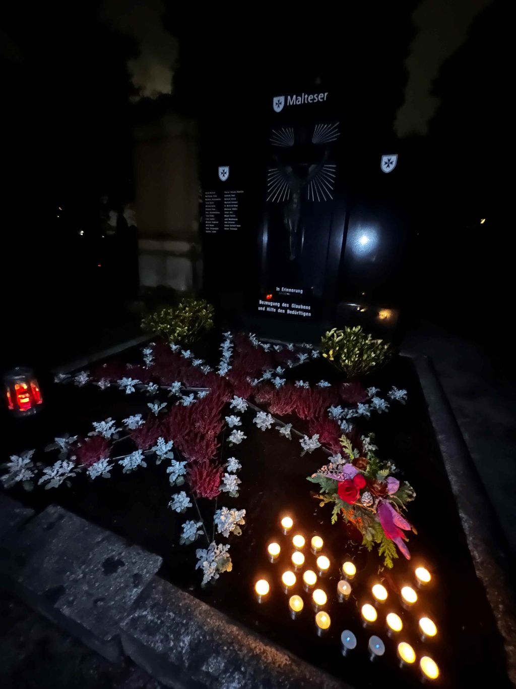 Aschaffenburg. Mit einer Andacht mit Totengedenken haben die Malteser Aschaffenburg (Diözese Würzburg) Ende Oktober ihre Gedenkstätte für verstorbene Mitglieder auf dem Altstadtfriedhof eingeweiht und durch Stadtseelsorger Andreas Hanel segnen lassen. Auf dem Grabstein auf dem aufgelassenen Grab sind 24 Namen bislang verstorbener Malteser eingraviert. „Immer wenn ich hier vorbeigehe, habe ich ein Lächeln auf den Lippen“, sagte Stadt- und Kreisbeauftragter Claus Kolb. „Das fühlt sich gut an, mit diesen Menschen auch auf diese Weise verbunden zu sein“, so Kolb weiter und dankte den Ehepaaren Fleckenstein und Heitzenröther, die sich um die Bepflanzung in Form des Malteserkreuzes kümmern. An der Andacht nahmen viele ehemalige Aktive und auch Angehörige der Verstorbenen teil, darunter der ehemalige Stadt- und Kreisbeauftragte Werner Schlereth und die Ehefrau des langjährigen Bezirksgeschäftsführers Manfred Schubert. Auch der international renommierte Pianist Burkard Schliessmann, der erst im Sommer wieder den Kontakt zu „seinen“ Maltesern gesucht hatte, mit denen er sich seit seinem 10jährigen Ersatzdienst in den 80er Jahren sehr verbunden fühlt, war unter den Teilnehmenden.