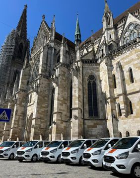 Zudem bekam jedes Fahrzeug noch eine Christophorus-Plakette. Angebracht am Armaturenbrett des Wagens, ist der Schutzpatron der Reisenden und Autofahrer in dieser Form nun immer dabei, wenn die Malteser im Straßenverkehr unterwegs sind. Maximilian Land, Stadt- und Kreisgeschäftsführer der Malteser Regensburg berichtete, es sei etwas Besonderes, so viele Fahrzeuge auf einmal in Betrieb zu nehmen und zeitgleich so viele neue Mitarbeiter einzustellen. Sein ausdrücklicher Dank galt dem Fahrdienstleiter Dirk Daume und seiner Assistenz Leonie Stenglein für die Organisation des gesamten Dienstes, einschließlich der Fahrzeugsegnung. In seiner Rede ergänzte Land: „Danke auch an Sie, liebe Fahrerinnen und Fahrer. Sie sind im kommenden Schuljahr unser Aushängeschild bei sehr wichtigen Menschen - unseren Kindern. Ich wünsche hierbei schon einmal viel Erfolg und Gottes Segen bei Ihrer Tätigkeit.“