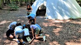 Nach einer ausgedehnten Brotzeit konnten die Kinder auf einem Hochsitz die Umgebung erkunden oder auf dem Barfuß- Pfad die unterschiedlichen Naturmaterialien an und mit ihren Füßen spüren. Fast wie nebenbei erfuhren sie sehr anschaulich, wie Photosynthese funktioniert und wie der Wald atmet. Weiter ging es zu einem riesengroßen Tipi, welches einlud zum Spielen und Innehalten.