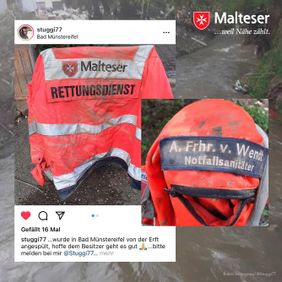 Ein aufmerksamer User auf Instagram informierte uns kürzlich darüber, dass in der Nähe eines Restaurants in Bad Münstereifel, das sich rund 400 Meter von der Rettungswache entfernt befindet, eine Einsatzjacke in der Erft angespült worden ist. Er brachte die Jacke in Sicherheit.