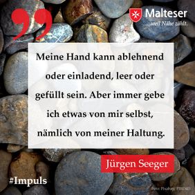 Als Malteser ist es uns ein besonderes Anliegen sich um Bedürftige – ganz besonders um Arme und Kranke – zu kümmern. Bleiben wir weiterhin für die Sorgen und Nöte der Menschen offen, ganz besonders in dieser schweren Zeit. Lassen wir uns weiterhin anrühren von der Hand, die uns entgegengestreckt wird, erkennen wir in ihr die Hand Jesu und begreifen in diesem Zusammenhang auch unsere eigene Armut. "Streck dem Armen deine Hand entgegen" (vgl. Sir 7,32).