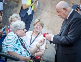 Präsident Georg Khevenhüller nutzte die kurze Gelegenheit nach der Papstmesse als Franziskus die Bischöfe und Gäste noch kurz begrüßte. Beim Händeschütteln griff er schnell in seine Hosentasche und überreichte sie dem Heiligen Vater mit einem besonderen Gruß von Helga stellvertretend für alle der 800 Pilger dieser Wallfahrt. So hat der Papst eine bleibende Erinnerung an die 12. Romwallfahrt der Malteser aus Deutschland bekommen.