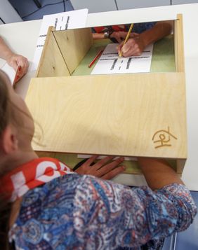 Einfache Alltagsaufgaben - etwa beim Essen mit Messer und Gabel: Was gesunde Menschen fast schon ohne darüber nachzudenken tun können, ist auf einmal viel schwieriger, wenn man nicht auf seine Hände, das Besteck und den Teller schauen darf – bei „Hands on Dementia“ sehen die Teilnehmer ihre Hände und das „Essen“ nur per Spiegelbild. Und haben damit ganz schön zu kämpfen. „Hä? Wie soll das gehen?“ fragte sich etwa eine junge Frau bei ihrem ersten Versuch. „Was ist mit meinen Händen los?“ Solche Momente der Verwirrung werden prompt durch das Kommentar des Gruppenpartners verschärft: „Du musst einfach schneller reagieren.“ Während beim Essen der Kampf gegen die eigenen Erwartungen zu führen ist, geht es bei der Station „Aufräumen“ gegen die Zeit. Eine Stoppuhr sorgt für zusätzlichen Stress – und viele scheitern an den vermeintlich einfachen Aufgaben, die sonst in zwei Minuten locker zu schaffen wären.