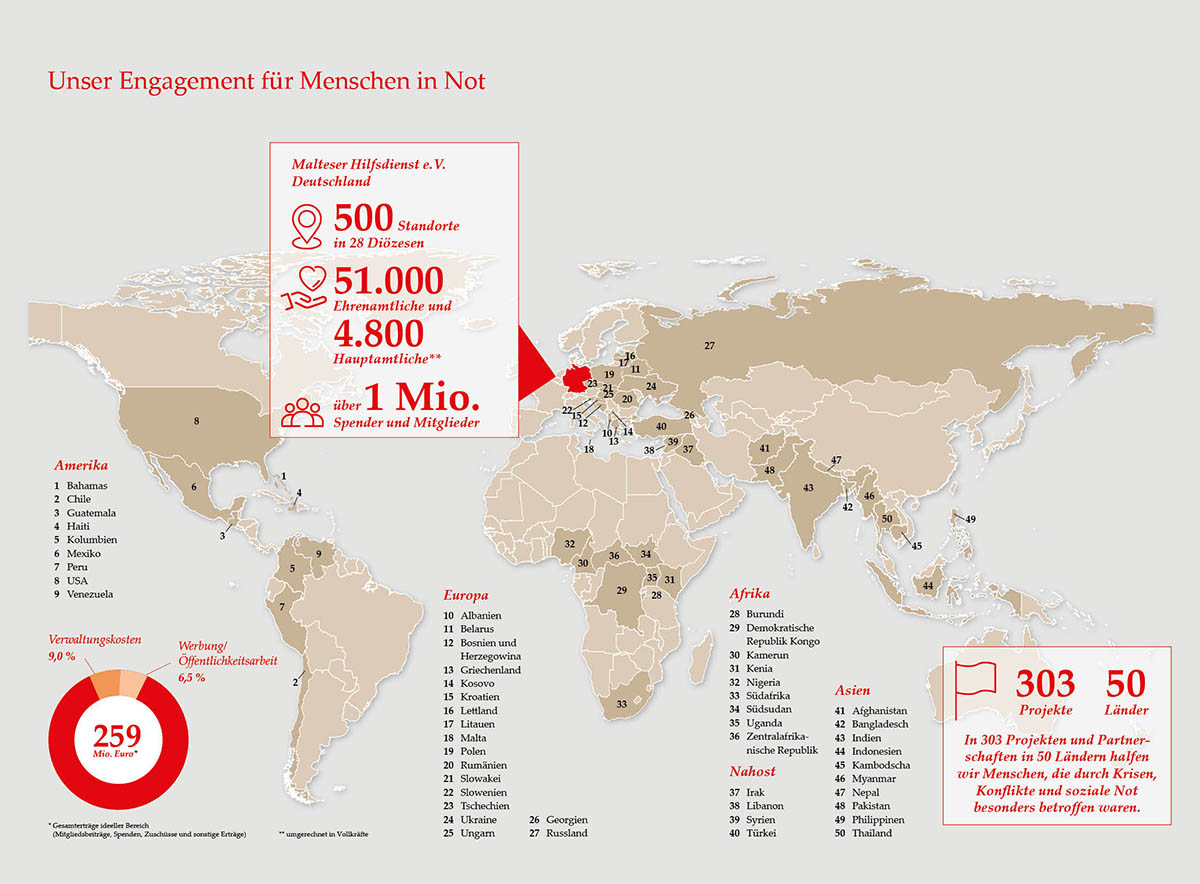 Mit Ihrer Spende an den Malteser Hilfsdienst e.V können wir Menschen, die in Not geraten sind, effektiv, langfristig und nachhaltig helfen. Unser Ziel ist es, diesen Menschen ein Leben in Gesundheit und Würde zu ermöglichen. Ihre Spende trägt dazu bei, dass wir dieses Ziel erreichen können. Auf dieser Seite finden Sie Informationen darüber, wo und wie wir im vergangenen Jahr dank Ihrer Unterstützung Hilfe leisten konnten.