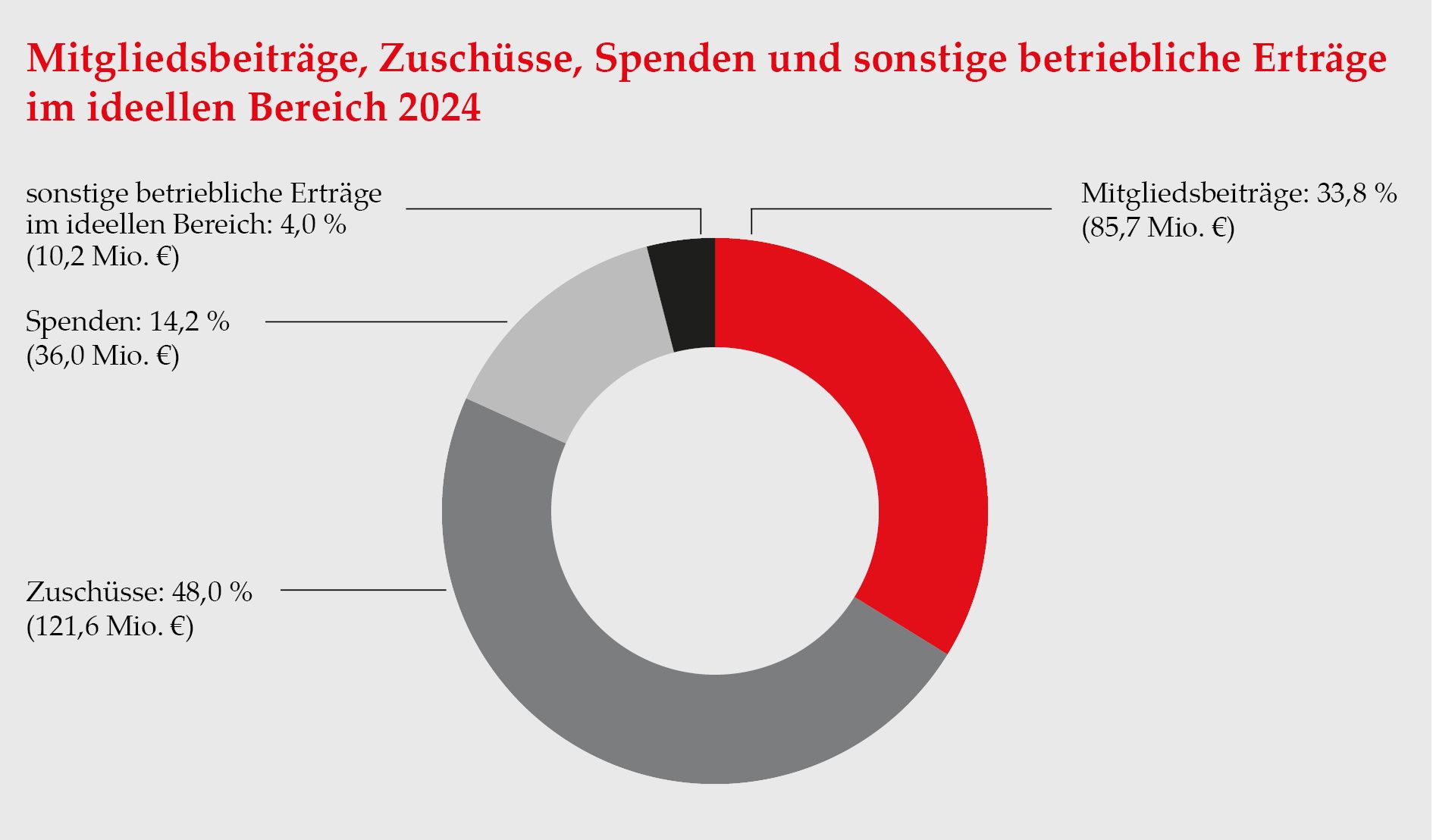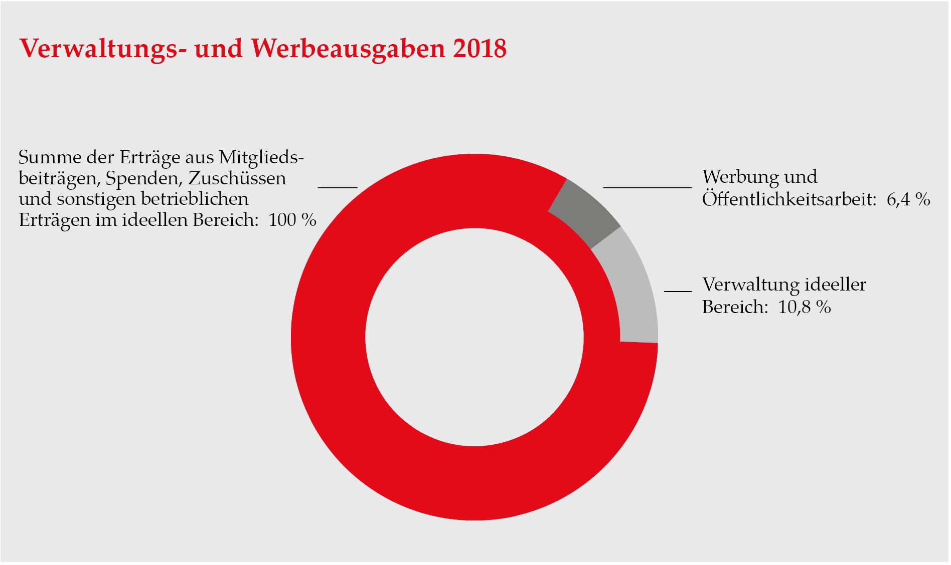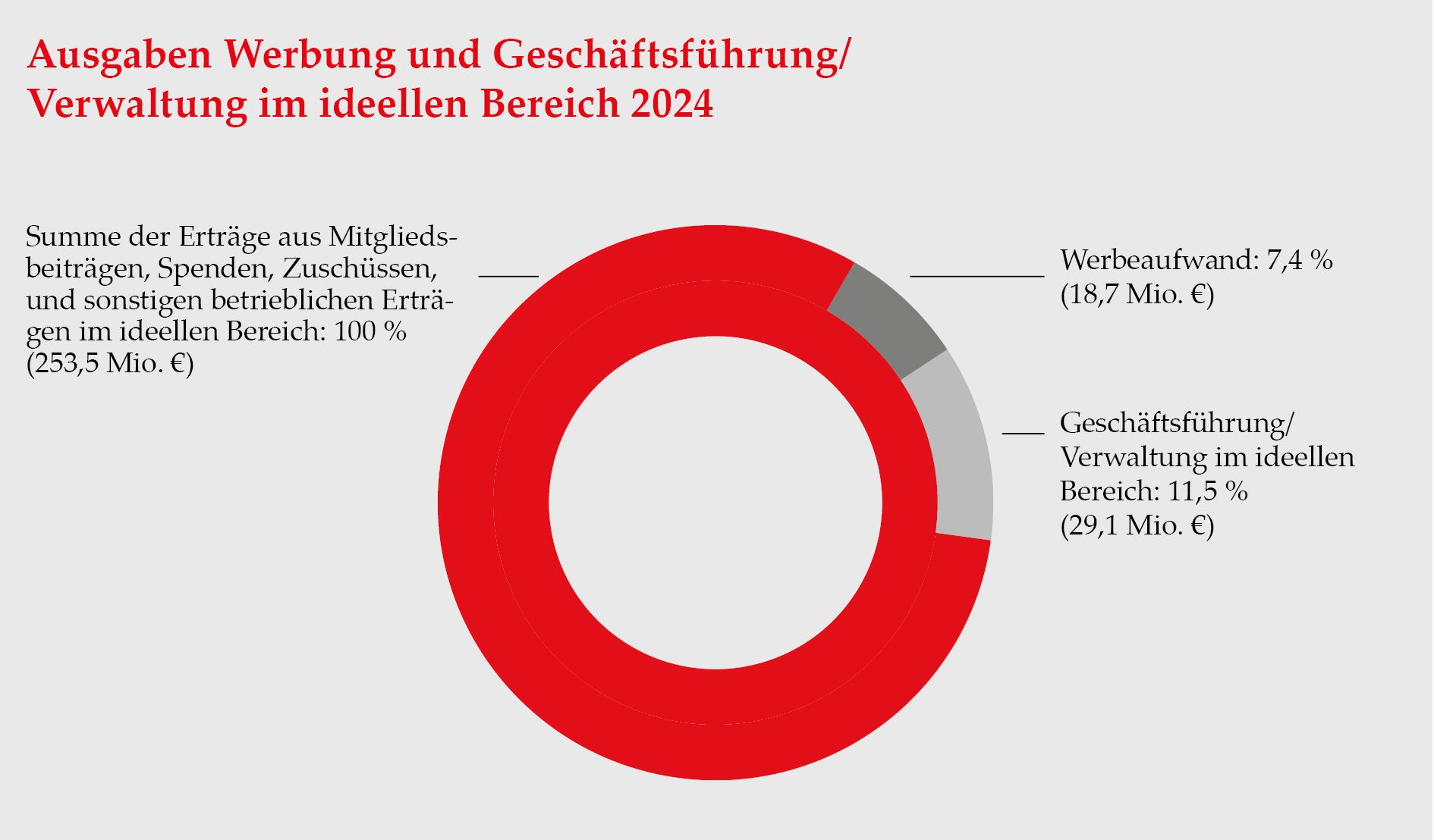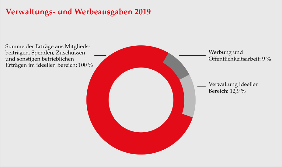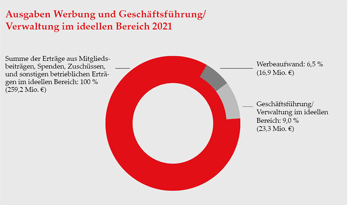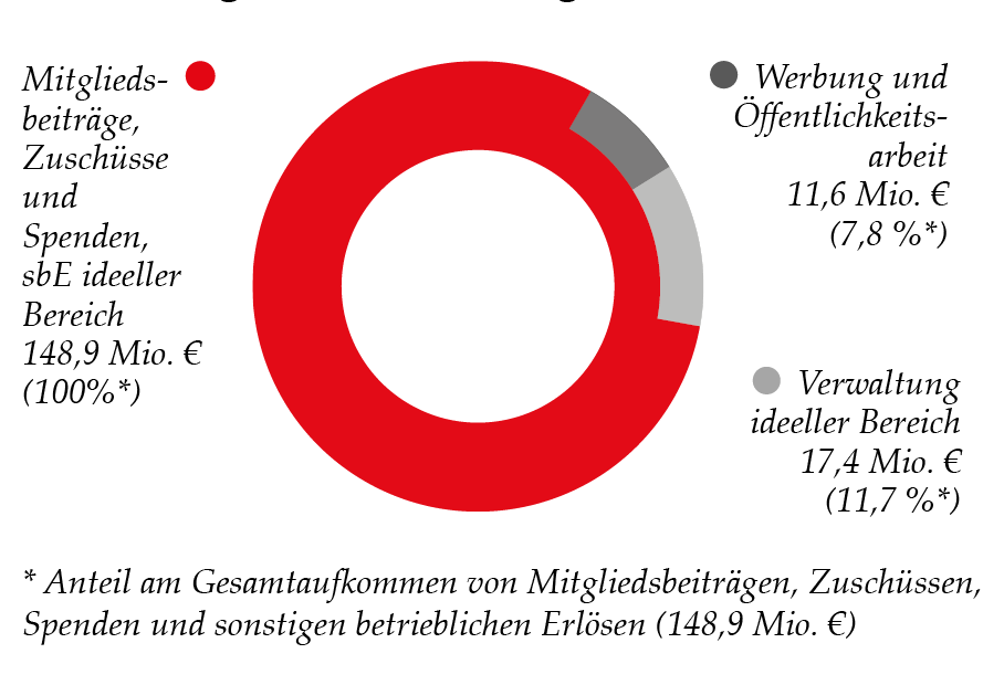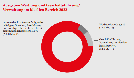 Der Anteil der Verwaltungskosten belief sich im Jahr 2024 auf 11,5 % des Gesamtaufkommens von Mitgliedsbeiträgen, Zuschüssen, Spenden und sonstigen betrieblichen Erlösen. Für Werbung und Öffentlichkeitsarbeit wurden 7,4 % aufgewendet.