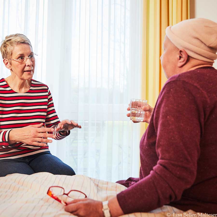 Petra W. möchte in ihren letzten Lebensmonaten nicht allein sein. „Die Last, die Angst, dass ich sterbe und niemand mich findet – die ist jetzt weg. Ich bin unendlich dankbar, hier zu sein. Mein Mann ist 2012 gestorben, auch an Krebs.“ Petra W. wirkt ruhig und gefasst, während sie von ihrem Aufenthalt im stationären Malteser Hospiz St. Raphael erzählt. Die 67-Jährige ist vor vier Jahren an Krebs erkrankt und hat mittlerweile zwei Metastasen im Kopf. Eine Heilung ist nicht mehr möglich. „Ich hatte mehrere Pflegedienste zu Hause, als klar war, dass ich nicht mehr gesund werde. Aber irgendwann reichte das nicht mehr aus. Hier weiß ich, wenn ich Hilfe brauche, dann ist direkt jemand da. Ich liege nicht irgendwo alleine hilflos, das beruhigt mich sehr.“