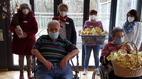 Die geltenden Pandemie-Maßnahmen verhindern eine persönliche Übergabe. „Da die Sicherheit aller Beteiligten natürlich Priorität hat, überreichen stellvertretend zwei der Ehrenamtler:innen und Marion Römers die Bastelwerke an die Einrichtungsleitung Gabriele Schmidberger, Frau Arnold vom sozialen Dienst und Bewohner:innen aus dem Wohnbeirat. Sie verteilen die Geschenke dann als österlichen Maltesergruß.