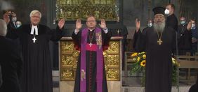 Sie feierten am Altar gemeinsam Gottesdienst: Der Vorsitzende der Deutschen Bischofskonferenz, Bischof Georg Bätzing, der Vorsitzende der Evangelischen Kirche in Deutschland, Landesbischof Heinrich Bedford-Strohm, der Vorsitzende der Arbeitsgemeinschaft Christlicher Kirchen in Deutschland, Erzpriester Radu Constantin Miron, sowie je ein Vertreter der jüdischen und der muslimischen Gemeinden der von der Flut betroffenen Regionen. Es sang und spielte die Dommusik Aachen.