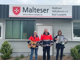 Zusammen mit dem Stadtbeauftragten der Malteser in Bad Laasphe Michael Hermann haben Stephanie Amos, die erste ehrenamtliche Besucherin und Julia Niemeyer, Projektreferentin „Klang und Freude“ schon mal die Instrumente ausgepackt. (Foto: Malteser Bad Laasphe)