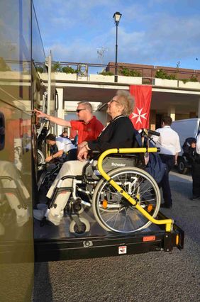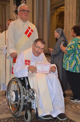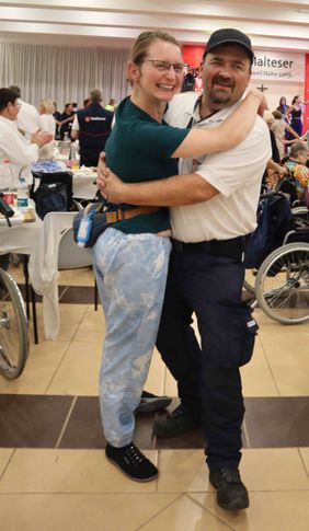 Würzburg/Unterfranken. „Ich hatte ja ein bisschen Angst vor der Woche, aber jetzt bin ich überglücklich“, Anna-Lena Demant aus Aub sitzt nach einem schweren Verkehrsunfall im Rollstuhl und auf pflegerische Unterstützung angewiesen. Dennoch hatte sie sich für die Malteser Romwallfahrt für Menschen mit Behinderung angemeldet und es nicht bereut. Eine Woche lang war sie zusammen mit der 35köpfigen Pilgergruppe aus ganz Unterfranken in der Ewigen Stadt unterwegs. 16 ehrenamtliche Malteser, darunter ein Seelsorger und ein Arzt sowie Rettungsdienstler, Pflegekräfte und Pflegehilfskräfte, kümmerten sich um die 19 Teilnehmenden mit und ohne Handicap. Jeden Tag feierten sie mit den anderen 600 Teilnehmern der Malteser Sternwallfahrt aus ganz Deutschland einen feierlichen Gottesdienst in einer der großen römischen Basiliken. Dabei hatten Einzelne auch immer Aufgaben im Altarraum und waren als Ministranten oder Bannerabordnung mit eingebunden. „Wir durften im Petersdom zu ministrieren“, erzählen Arnold Goblirsch und Gabriele Kullmann begeistert von ihrem Dienst im Gottesdienst. Die beiden wohnen in einer Einrichtung der Lebenshilfe Aschaffenburg und sind auch zuhause regelmäßige Kirchgänger, kennen sich aus. Aber sie singen nicht nur bei allen Kirchenliedern kräftig mit, die auf der Fahrt im Bus angestimmt werden, sondern auch bei sämtlichen Schlagern und Volksliedern.