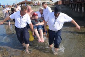 Nach all der Aufregung tut der entspannte Ausflug in den Küstenort Ostia am Donnerstag gut – und ist wieder voller schöner Momente, waren doch viele der Teilnehmenden mit Behinderung schon lange nicht mehr am Meer. Damit Alexander Stierkorb aus Buch bei Aub seine Füße in Wellen stecken und die Weite schauen kann, tragen ihn die Malteser zu viert an die Wasserkante. „Dafür sind wir Malteser ja da“, sagt Diakon Anton Siegler aus Lohr, der als Seelsorger den Bus begleitet. Andere brauchen nur einen stützenden Arm und die Sicherheit, dass jemand im Zweifel da ist, der hilft. Wieder andere genießen von der hölzernen Balustrade den Blick auf das fast sommerliche Treiben am Strand. Ein Cappuccino zum Lunchpaket macht das italienische Flair komplett.