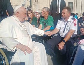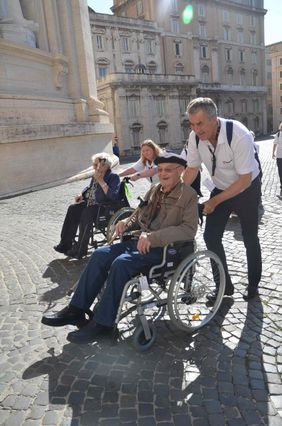 Großer Höhepunkt war die Teilnahme an der Generalaudienz von Papst Franziskus am Mittwoch auf dem Petersplatz. Die Rollstuhlfahrer saßen ganz oben neben dem Baldachin des Papstes und hatten so einen uneingeschränkten Blick auf das Kirchenoberhaupt. Nach der so genannten Katechese fuhr Papst Franziskus sogar mit seinem Rollstuhl durch die Reihen und gab allen die Hand. „Des glebbt mir dahemm kenner“, war Hildegard Münch aus Ochsenfurt überwältigt von der so persönlichen Begegnung. Mit dem Malteserhelfer Christian Margraf aus Abersfeld, Landkreis Schweinfurt, wechselte der Papst sogar ein paar Worte: „Ich habe dem Heiligen Vater gesagt, dass wir für ihn beten würden, und das hat ihn wohl sehr gefreut“, erinnert sich der Krankenpfleger, der heuer zum fünften Mal als Ehrenamtlicher an der Wallfahrt teilnahm.