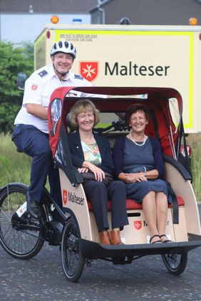Zum Abschluss des „offiziellen Teils“ stellte Stadtbeauftragter Archut das neueste Dienstfahrzeug der Malteser-Gliederung vor, eine Fahrrad-Rikscha mit Elektro-Unterstützung, mit der künftig Ausflüge für Menschen mit Mobilitätseinschränkungen angeboten werden sollen. Ermöglicht hatten der Förderkreis "Artusrunde" der Honnefer Malteser und das Hilfswerk Weihnachtslicht e.V. des Bonner General-Anzeigers die Anschaffung. Abteilungsleiterin Köhle und Vizelandrätin Kunert gehörten zu den ersten Fahrgästen, die das neue Angebot ausprobierten, und eine ganze Reihe von Interessenten nutzte die Gelegenheit zu einer Probefahrt als „Piloten“ des innovativen Gefährts. Denn diese werden derzeit noch gesucht!