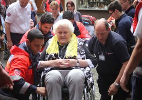Eine Besonderheit in diesem Jahr: Die teilnehmenden Rollstuhlfahrer konnten durch eine „Heilige Pforte“ in die Basilika gelangen, die anlässlich des von Papst Franziskus ausgerufenen Heilgen Jahres der Barmherzigkeit dort eingerichtet worden war. Möglich wurde dies trotz mehrerer Stufen durch eine eigens mitgebrachte Rampe, die sich bereits bei der Rom-Wallfahrt der Malteser bewährt hatte. Rollstuhl für Rollstuhl wuchteten die Malteser-Helfer über die metallenen Schienen in das Kirchenschiff. Dabei packten auch die Honnefer Helfer Sameer, Ehab und Sattar kräftig mit an. Die zwei Syrer und der Iraker sind über einen Erste-Hilfe-Kurs für Flüchtlinge zu den Maltesern gestoßen und haben anschließend in der Helfergrundausbildung auch den Umgang mit dem Rollstuhl gelernt.