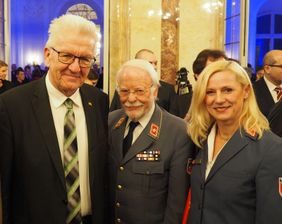 Beim Neujahrsempfang im Neuen Schloss bedanken sich Malteser Bezirksreferentin Annette Traub und Malteser Landesbeauftragter Edmund Baur bei Ministerpräsident Winfried Kretschmann für seine Zusage zur gemeinsamen Johannisfeier von Maltesern und Johannitern am 24. Juni 2020 in Stuttgart. Foto: Diana Rasch