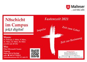 Balve – Mit Beginn der Fastenzeit bietet der Malteser Hilfsdienst e.V. Balve wieder dienstagsabends ein Abendgebet mit Impulsen, Besinnung und Gebeten an. Beginnend am 23. Februar um 20 Uhr findet diese N8schicht, aufgrund der noch andauernden Beschränkungen durch die Corona-Pandemie, digital über Microsoft-Teams statt. Die Teilnahme ist über den Link: Zugang: https://bit.ly/36vJtgl via Internet möglich. Wer nicht die technische Möglichkeit besitzt, kann sich auch über Telefon unter der Rufnummer 069 677765613 und der Telefonkonferenz-ID: 971 648 475# zuschalten, um den Texten am Telefonhörer zu lauschen.