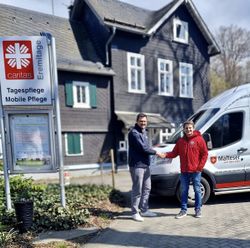 Malteser Spezialfahrzeug fährt Gäste der Caritas-Tagespflege, die auf einen Rollstuhl angewiesen sind, sicher in die Einrichtung auf der Eremitage.