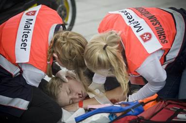 Die Schulsanitäter der Malteser kennen sich aus. Wenn etwas passiert, kümmern sie sich um die Erstversorgung des Patienten und rufen den Rettungsdienst, falls notwendig.