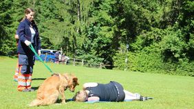 Bei dieser Übung stand die gestürzte Person plötzlich auf und lief schreiend davon – Selina Busses Hund „Bailey“ reagierte vorschriftsmäßig gelassen. (Foto: Malteser BGL)