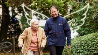 Lotsin der Berliner Hausbesuche im Gespräch mit Seniorin bei einem Hausbesuch.