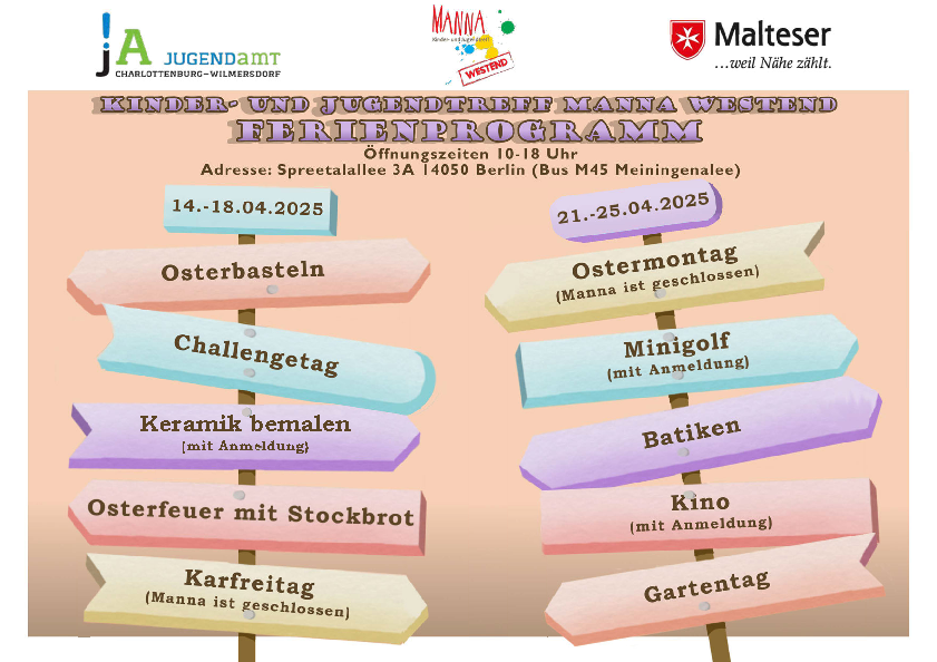 Der Kinder- und Jugendtreff MANNA Westend ist ein offenes Haus für alle im Alter von 6 bis 27 Jahren. Mit den Schwerpunkten Naturpädagogik, politische Bildung und Beteiligung bieten wir als offene Einrichtung einen vernetzten Anlaufpunkt für alle, die Lust haben, ihre Freizeit nicht zu vergeuden, sondern mit Spaß gewinnbringend zu nutzen.