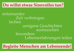 Никто не хочет оставаться в одиночестве в трудные часы. Это особенно верно, когда человек очень болен или умирает. Поддержка помогает, укрепляет и успокаивает. Мы ищем мужчин и женщин с жизненным опытом и добрым сердцем, которые хотели бы пройти у нас обучение для добровольных помощников хосписа.