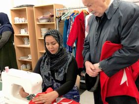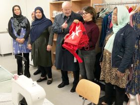 25 ehrenamtliche Integrationslotsen der Malteser unterstützen in der Einrichtung die dort lebenden Frauen und Männer in ihrem Alltag, bei Behördengängen oder Schulanmeldungen der Kinder und bieten Freizeitaktivitäten an. So zeigte sich der Großmeister bei seinem Besuch auch interessiert an dem Projekt „Nähstube“, das die Malteser für geflüchtete Frauen initiiert haben. Sie überreichten ihm einen selbstgenähten Rucksack mit Malteserkreuz. In einem der gemeinschaftlich genutzten Räume kommen die Frauen montags und donnerstags zum Nähen und Plaudern zusammen. Auch Mädchen und Frauen aus anderen Berliner Flüchtlingsunterkünften sind dort willkommen.