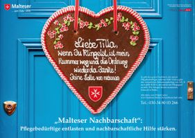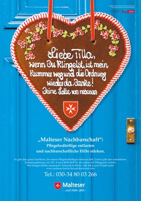 Berlin. In der Hauptstadt starten die Malteser am Mittwoch, 4. September eine Werbekampagne für ein neuartiges Angebot geförderter Nachbarschaftshilfe. „Malteser Nachbarschaft“ heißt das Projekt, das Pflegebedürftige besser entlasten und nachbarschaftliches Engagement stärken soll. Dabei handelt es sich um eine gemeinsame Initiative der Berliner Gesundheitssenatorin Dilek Kalayci und dem Malteser Hilfsdienst Berlin (www.malteser-berlin.de/nachbarschaft).