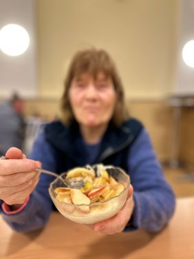 An diesem Freitag gibt es kräftigen Hackbällchen-Eintopf, dazu Salat und später Grießbrei mit Apfel und Zimt. Nichts Extravagantes, aber warm, sättigend und liebevoll zubereitet. „Genau richtig bei dieser Kälte“, sagt eine Helferin, während sie dampfenden Kakao in Thermoskannen füllt.