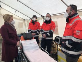 Die Regierende Bürgermeisterin von Berlin, Franziska Giffey, hat Freitagmittag die am Tag zuvor errichtete Erstkontaktstelle am Zentralen Omnisbusbahnhof (ZOB) am Funkturm besucht, um sich über die Situation vor Ort zu informieren. Dort haben die Berliner Malteser im Auftrag der Senatsverwaltung eine Erstkontaktstelle für Kriegsflüchtlinge, die hier zu Hunderten aus der Ukraine ankommen, eingerichtet. Die Malteser koordinieren unterstützend am Omnibusbahnhof das bereits vorhandene breite bürgerschaftliche Engagement. Darüber hinaus haben sie beheizte Zelte aufgebaut für die Erstbetreuung sowie medizinische Erstversorgung der Ankommenden.