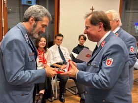 Die Jugend ist gut vorbereitet für den feierlichen Gründungsabend. Alle wichtigen Ämter im Ortsvorstand hat sie bereits besetzt. Gemeinsam mit Diözesangeschäftsführer Marc Johannes Czernetzki überreicht Diözesanleiter Dr. Jörg von Fürstenwerth dem neuen Beauftragten die Berufungsurkunde. Stepan Vorontsov, stv. Diözesanjugendsprecher, wird neuer Ortsbeauftragter, Schul- und Einsatzsanitäterin Helena Webers, seine Stellvertreterin. „Das ist schon ein ganz besonderer Vorgang: eine ganz junge Gliederung, die aus der Malteser Jugend hervorgegangen ist. Alle gut ausgebildet, alles aktive oder ehemalige SchulsanitäterInnen und alle hoch motiviert und voller Elan“, so Diözesanleiter Fürstenwerth sichtlich beeindruckt. Für die Zukunft gibt er Ihnen mit auf den Weg: „Sucht Euren Weg und geht Euren Weg. Pflegen Sie Ihren Umgang miteinander und reden sie vor allem miteinander und unterstützen Sie sich gegenseitig!“