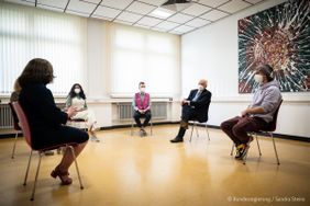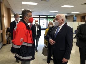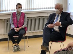 Zuvor hatte sich der Bundespräsident in einer Gesprächsrunde mit Schülerinnen und Schülern, Lehrerinnen und Lehrer sowie Aktiven des mobilen Impfteams der Malteser darüber unterhalten, wie junge Menschen noch mehr zum Impfen motiviert werden können und warum einige in dieser Altersgruppe verunsichert sind. Timo Kitzelmann (29), Helfer im Mobilen Impfteam der Malteser, gab dem Politiker Einblicke in die Arbeit der mobilen Teams, die aus je drei Helfenden der Malteser, einem Arzt und einem pharmazeutischen Mitarbeiter bestehen. „Anders als im Impfzentrum kommen die jungen Leute bei Impfaktionen an Schulen mit viel mehr Fragen auf uns zu. Manche haben Angst vor der Spritze. Die Ärzte schaffen es aber meist, ihnen im Aufklärungsgespräch ihre Ängste zu nehmen“, sagt der 29-Jährige, der auch im Impfzentrum der Malteser gearbeitet hat. Dort war er für die Dokumentation der Unterlagen der Impfgäste zuständig.