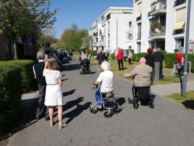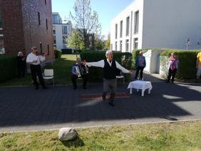 An die 1,50 Meter-Abstandsempfehlung halten sich die Senioren auch während des Konzerts. Der Tenor geht durch die Gassen des Wohnparks, damit alle Senioren etwas vom Konzert haben. Zu hören gibt es Lieder wie "Schön wie der junge Frühling", was prima zum sonnigen Wetter passt. Von den Senioren gibt es dafür viel Applaus.